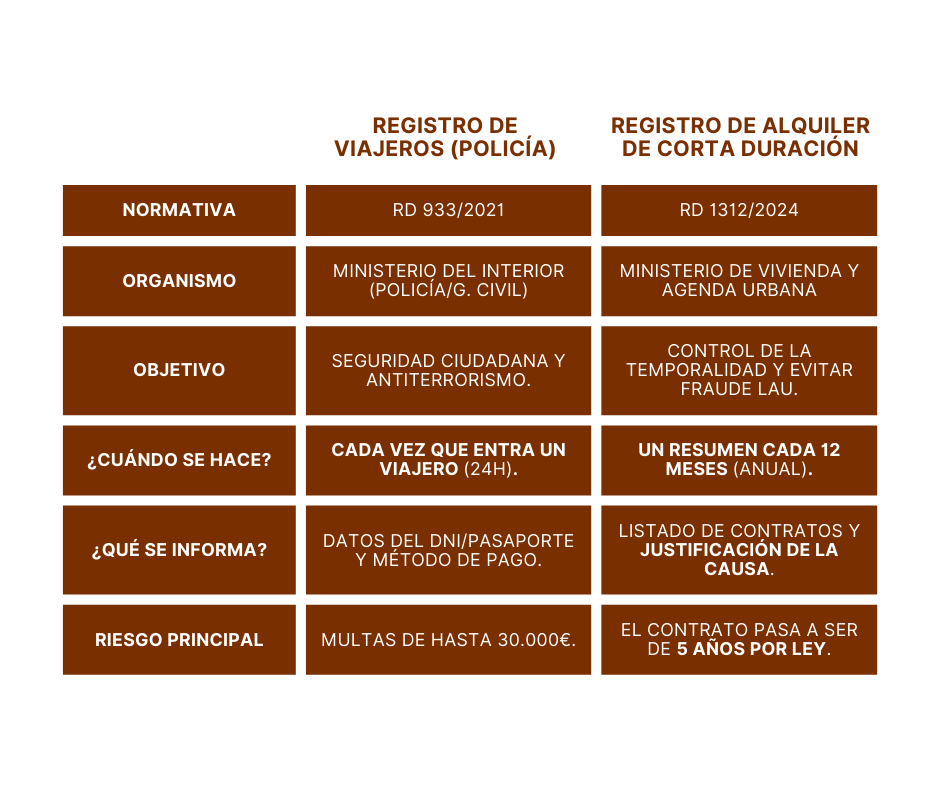 No. Son obligaciones distintas. El registro policial es por seguridad ciudadana (RD 933/2021), mientras que este nuevo registro del Ministerio de Vivienda es un control sobre la causa de la temporalidad. Como asesoría, nos encargamos de que este último esté blindado para evitar el fraude de ley.